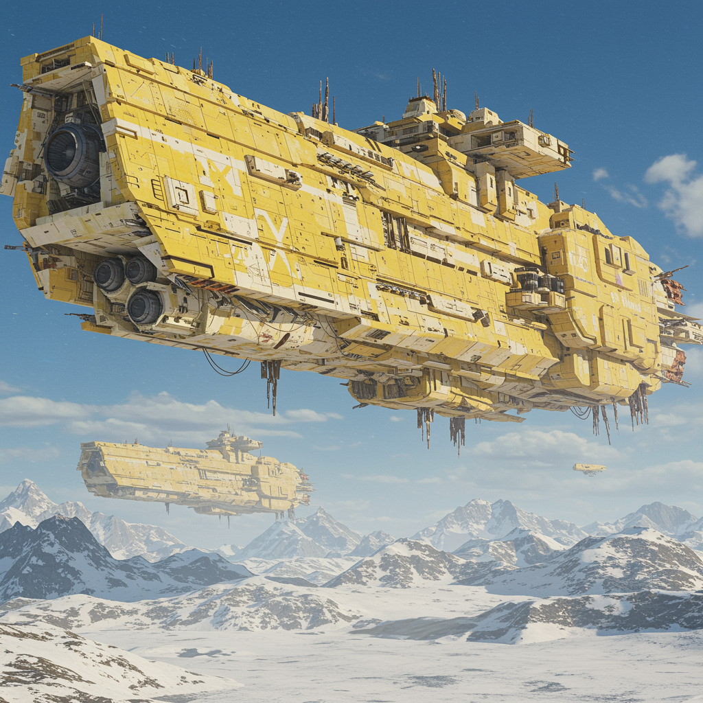 A colossal futuristic spaceship hovers majestically over a vast expanse of snow and ice, its structure bathed in tones of yellow and beige. Echoing the grandeur of fantastical ruins, the vessel exudes an industrial charm reminiscent of Viktor Vasnetsov's detailed architectural scenes. Its monumental scale is accentuated by elements of rusty debris, creating the impression of an ancient technological marvel. The intricate modular construction, inspired by the works of Dariusz Klimczak and Leszek Bujnowski, showcases detailed world-building, with its majestic form standing as a testament to a bygone era. The scene is rendered in high definition with a meticulous attention to detail, reflecting the elegance and refinement found in the portraiture of Alexei Harlamoff. This masterpiece of imagination captures a harmonious balance between the imposing monumentality of the ship and the serene beauty of the snowy peaks beneath.