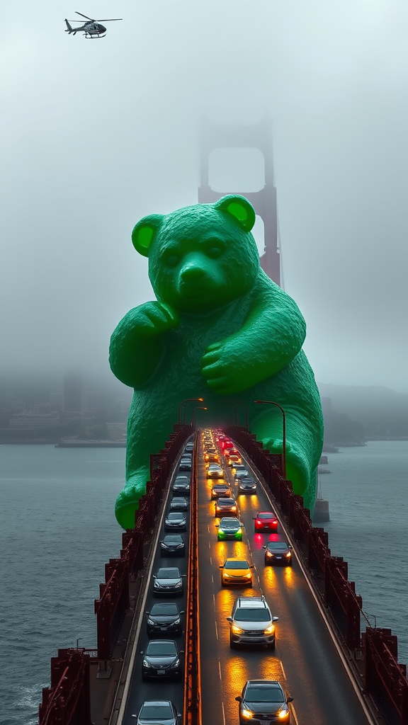 A colossal green gummy bear emerged from the misty San Francisco Bay, lumbering onto the Golden Gate Bridge and causing chaos as its sticky, vibrant form engulfed lanes of traffic. Cars screeched to a halt, drivers fleeing in terror as the gelatinous behemoth heaved its way along the famed structure. Its every move created seismic shudders, sending chunks of asphalt tumbling into the churning waters below. Panic rippled through the city, the bear's sugary scent contrasting sharply with the doomsday atmosphere. Helicopters circled overhead, capturing scenes of the bridge swaying precariously under the creature's weight, while onlookers watched in shock and awe at the unfolding surreal catastrophe.