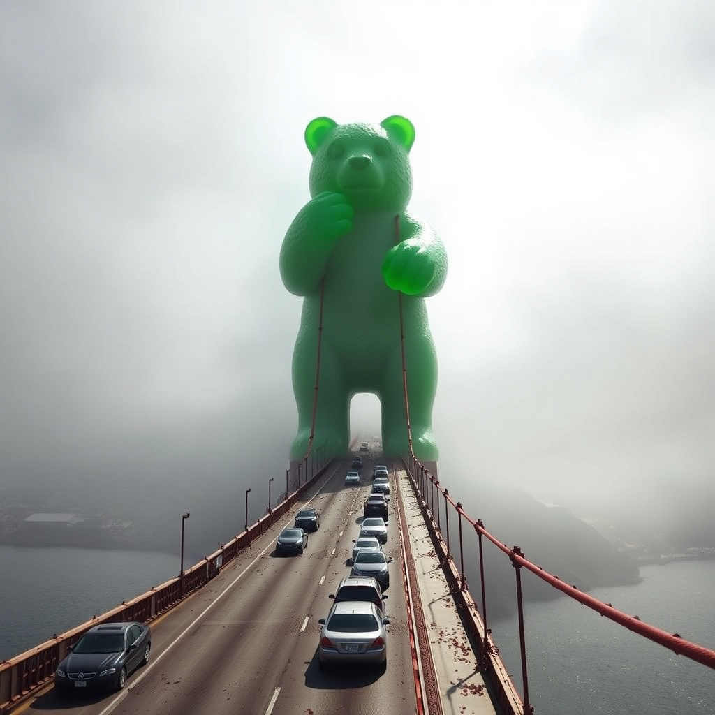 A colossal green gummy bear emerges from the mist, towering over the Golden Gate Bridge, its gelatinous form shimmering under the San Francisco sun. As it lumbers onto the iconic structure, vehicles screech to a halt, drivers paralyzed by the surreal spectacle. Chaos erupts as the mighty candy creature sways, its massive paws scattering cars like toys, sending ripples of destruction down the bridge. Panic spreads like wildfire through the city, the monstrous gummy bear casting an eerie shadow over the bay, its footsteps echoing a cinematic apocalypse.