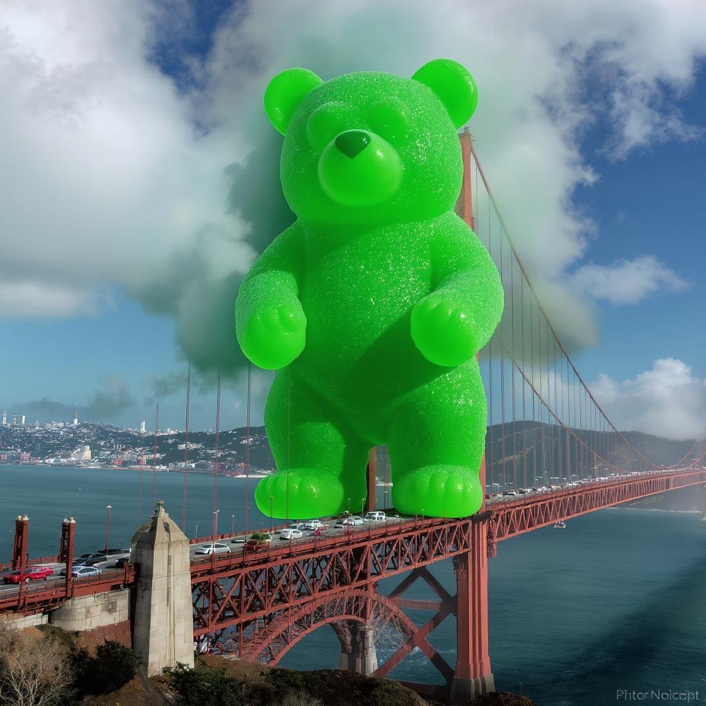 A colossal green gummy bear looms over the Golden Gate Bridge, causing chaos and gridlock as traffic comes to a standstill; panic spreads like wildfire as towering paws inadvertently smash vehicles, casting a cinematic shadow of doomsday across the iconic landmark. Amidst the chaos, the massive candy creature seems both comical and terrifying, an unexpected harbinger of destruction with a sweet twist.