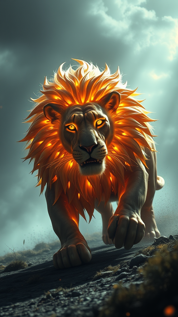 A colossal lion crafted from luminous, radiant materials charges with stunning beauty through a mysterious landscape, embodying raw power, primal fury, and divine majesty. Captured in an expansive, wide-angle scene with a dark fantasy ambiance, the image showcases impeccable depth of focus. Shot using advanced CGI techniques, the scene evokes a sense of awe, as if immortalized through the lens of a Hasselblad H6D-400c Multi-shot camera paired with a Mitakon Speedmaster 300mm f/5, and enhanced by creative mood lighting.
