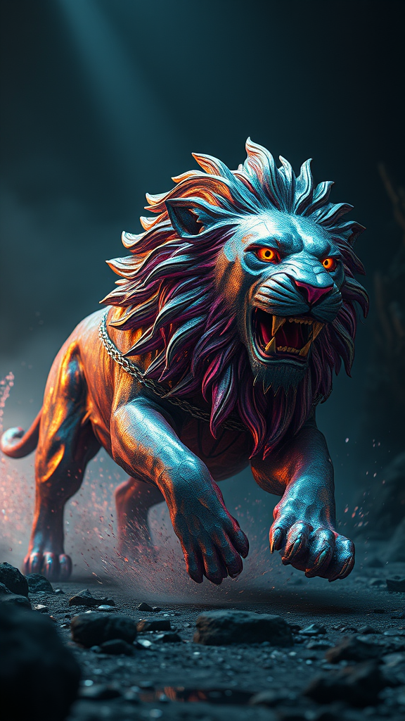 A colossal lion sculpted from iridescent materials, exuding an aura of ferocious beauty as it sprints through a mystical realm, embodying raw power and divine wrath. Captured in an epic wide shot that immerses the viewer into a mesmerizing dark fantasy setting, the scene is brought to life with cutting-edge CGI and an intricate depth of field. Photographed with a Hasselblad H6D-400c, paired with a Mitakon Speedmaster 300mm f/5 lens, featuring 6 XCD, the image is drenched in moody lighting that enhances its ethereal, otherworldly allure.