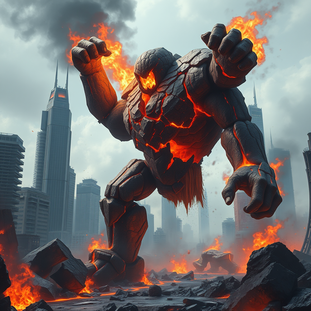 A colossal living lava golem, its molten core pulsating like a fiery heartbeat beneath a fractured rocky exterior, stands mid-battle in a devastated futuristic cityscape. Its blazing fists leave trails of acrid smoke as they swing with destructive force, melting steel and shattering glass in a cacophony of chaos. The surrounding skyscrapers, once towering symbols of human achievement, now succumb to the relentless heat, their foundations reduced to pools of glowing slag. The air is thick with ash and the acrid scent of burning, as the golem's every movement reshapes the urban landscape, leaving a path of primal destruction in its wake.