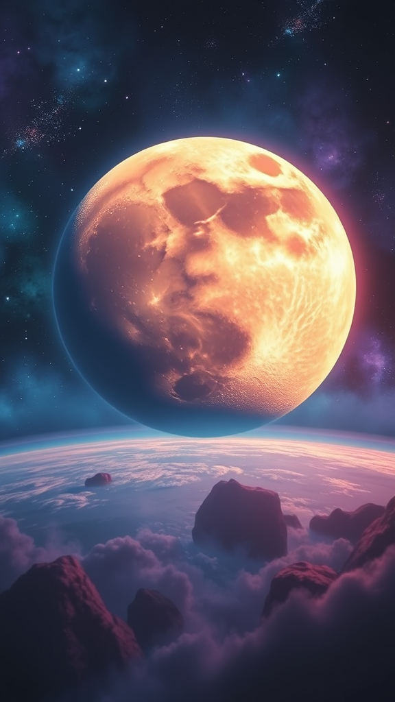 A colossal moon descending upon the earth, with nearby galaxies visible, bathed in vibrant and surreal hues, especially rich blues and purples, creating a cosmic and otherworldly ambiance. The scene unfolds in an abstract and dreamlike style, evoking a sense of awe and wonder.
