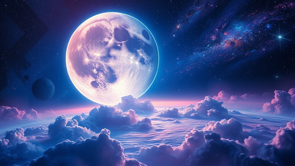 A colossal moon descends upon the earth, intertwining with the brilliance of distant galaxies, all bathed in vibrant, surreal hues with an emphasis on deep blues and rich purples. The scene exudes a cosmic, otherworldly atmosphere, embracing an abstract and dreamlike style. The surreal imagery dances with fluidity, capturing the profound essence of space and imagination.
