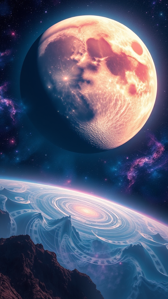 A colossal moon descends upon the earth, its immense form casting an awe-inspiring shadow. Surrounding galaxies whirl in a cosmic dance, their vibrant, surreal colors saturating the scene with rich blues and purples. The atmosphere is undeniably cosmic and otherworldly, filled with an abstract, dreamlike quality. Ethereal patterns ripple through the sky, creating an enchanting, hypnotic view that pulls the observer into this surreal celestial event.