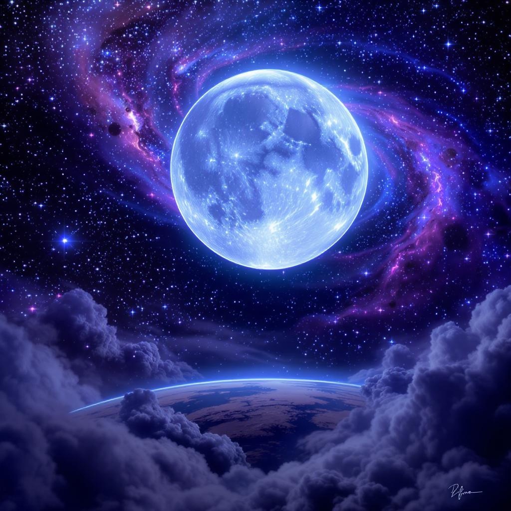 A colossal moon descends upon the earth, surrounded by swirling galaxies, bathed in a symphony of vibrant and surreal colors dominated by deep blues and rich purples. The scene evokes a cosmic, otherworldly atmosphere, blending abstract and dreamlike elements to create an ethereal vision. The celestial spectacle captures a moment suspended in time, where reality bends and imagination takes flight.