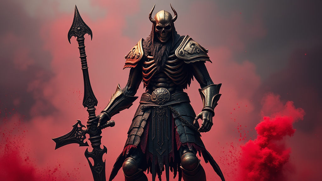 A colossal Norse-inspired warrior stands amidst a surreal landscape, embodying the essence of dark bronze and crimson hues. His form is both crumpled and deconstructive, with skeletal features that are eerily lifelike. Dusty remnants swirl around his presence, reinforcing a gothic atmosphere. The full-length figure dons intricately designed armor, each piece finely detailed with hyper-realistic allure. His formidable weapon exudes an ornate and intricate design, capturing the eye with its elaborateness. The scene is bathed in dramatic, photography-style lighting, enhancing the ultra-realistic, hyper-detailed quality of the portrayal. The ambiance suggests a dimension beyond the ordinary, enriched with unparalleled detail and realism, evoking a world that feels almost tangibly real.
