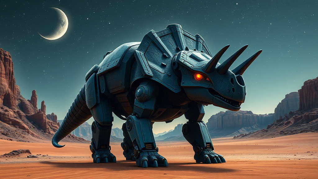 A colossal obsidian triceratops mech with glowing amber eyes stands majestically in a vast desert landscape, framed by rugged rock formations under a star-studded sky. A slender crescent moon casts a silvery hue over the scene, enhancing the cinematic atmosphere. The mech's intricate armor plating reflects subtle bluish tints, contrasting with the ochre sands. In 8K resolution, every detail is hyper-realistic, capturing the awe-inspiring fusion of prehistoric and futuristic elements.