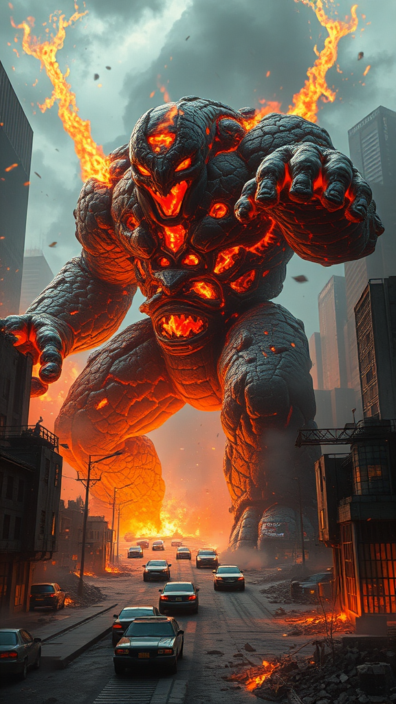 A colossal primordial living lava golem emerges amidst the chaos, its molten interior glowing fiercely through the network of cracks on its rocky exterior. In the midst of a martial onslaught, its blazing fists arc through the air, leaving trails of thick, choking fumes. The golem's incandescent form casts an eerie glow on the ravaged futuristic urban landscape around it. Skyscrapers crumble under its fiery assault, molten debris cascading from its monstrous attacks, while glowing lava slithers down concrete streets, melding with twisted metallic structures and setting abandoned vehicles ablaze. Embers dance in the thick, polluted air as the golem's fiery rage clashes with the cold, desolate shell of a once-vibrant city.