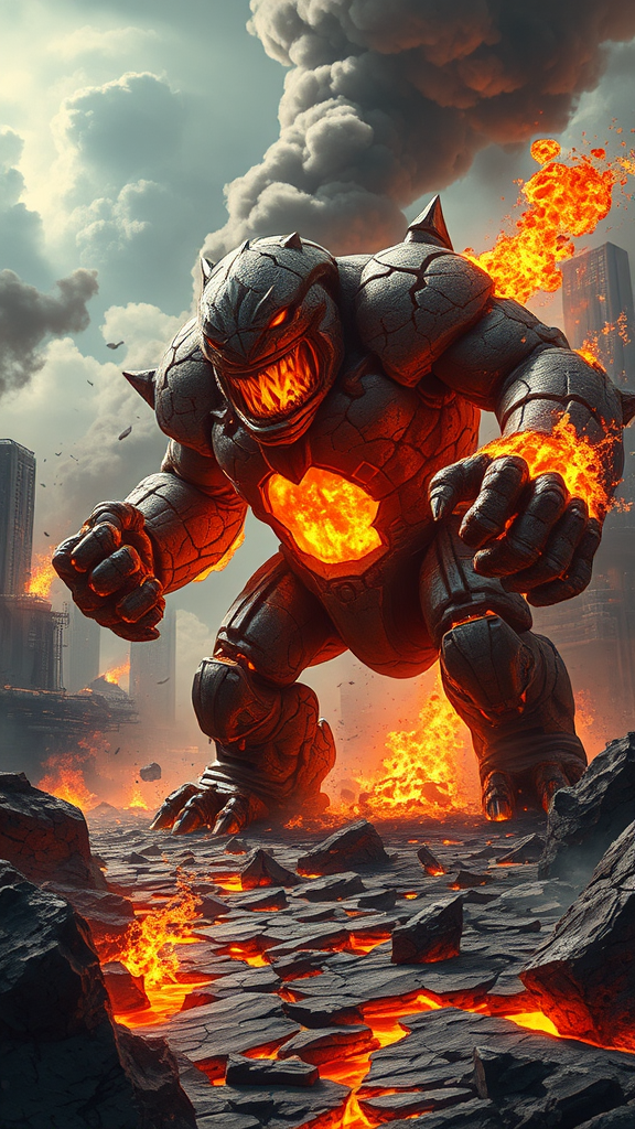 A colossal primordial living lava golem rampages through a ravaged futuristic urban landscape, its massive limbs composed of cracked rocky surfaces with a molten core visibly churning and glowing with an intense fiery light. Mid-martial onslaught, it swings blazing fists that leave trails of dense, choking fumes in their wake. The ground cracks and sizzles beneath its feet, molten lava spilling out and interacting violently with the futuristic structures, which warp, melt, and collapse under the relentless heat. Sparks fly as the golem's fiery essence meets advanced metal alloys, casting a hellish glow across the desolate cityscape while plumes of smoke and ash rise into the sky, further darkening the chaotic scene.