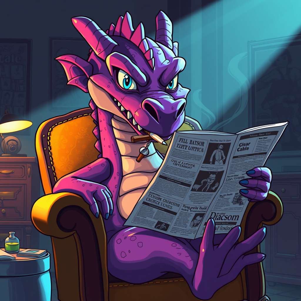 A colossal purple dragon with mischievous yet friendly blue eyes and a row of jagged spikes along its back lounges in a vintage armchair, a smoldering cigarette dangling from its lips. It immerses itself in a futuristic newspaper, enveloped in a retro cartoon vibe, where cinematic light casts dramatic shadows and highlights the whimsical contrast between its fearsome appearance and gentle demeanor.