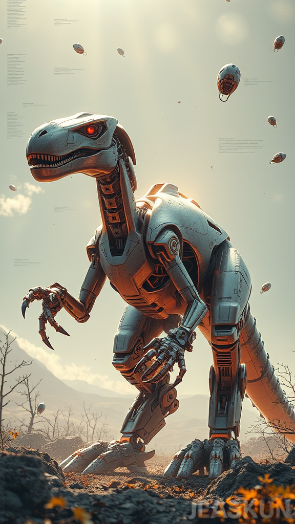 A colossal robotic raptor with an otherworldly design stands amidst a surreal landscape, textured with ultra-high definition raytracing that illuminates its mechanical form with ethereal godrays. Its metallic frame reflects the surrounding ambient light with an enigmatic glow, while intricate schematics intertwine across its body. The raptor's anatomy appears abstract, limbs and fingers not following traditional structure, as if designed by an alien intellect. A low-resolution aesthetic mingles with distorted, overlapping text and graphical errors, creating an impression of glitchy digital art. Some parts of its form seem cropped or out of focus, enhanced by scattered jpeg artifacts and remnants of digital watermarks. Its face and eyes are intriguingly deformed, adding a cybernetic mystique. Occasional duplicated features and floating components suggest the presence of malfunction or an artistic take on fragmented reality, piquing curiosity with its warped proportions and the illusion of dislocated parts suspended in the air.