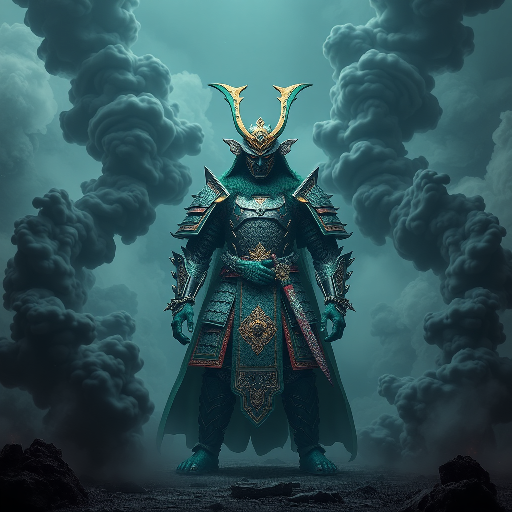 A colossal samurai deity cloaked in a verdant creature-like guise stands majestically, exuding an aura of divine power. Its presence is captured in an ultra-realistic style, reminiscent of Vincent van Gogh's swirling textures and FW Murano's intricate detailing. The entity is clad in an interstellar full-body armor that gleams with the enigmatic allure of a galaxy, each piece shimmering in cosmic hues. Surrounding it are imposing jet-black columns of smoke that twist and billow with a life of their own, enhancing the dark atmospheric mood. The scene unfolds with highly realistic, epic ultra-wide shots at a 135mm perspective, capturing the meticulous details of this divine warrior with key visual emphasis. The environment is charged with an ethereal energy, casting an almost mythical shadow over the landscape, inviting the viewer to immerse in its majestic and otherworldly presence.