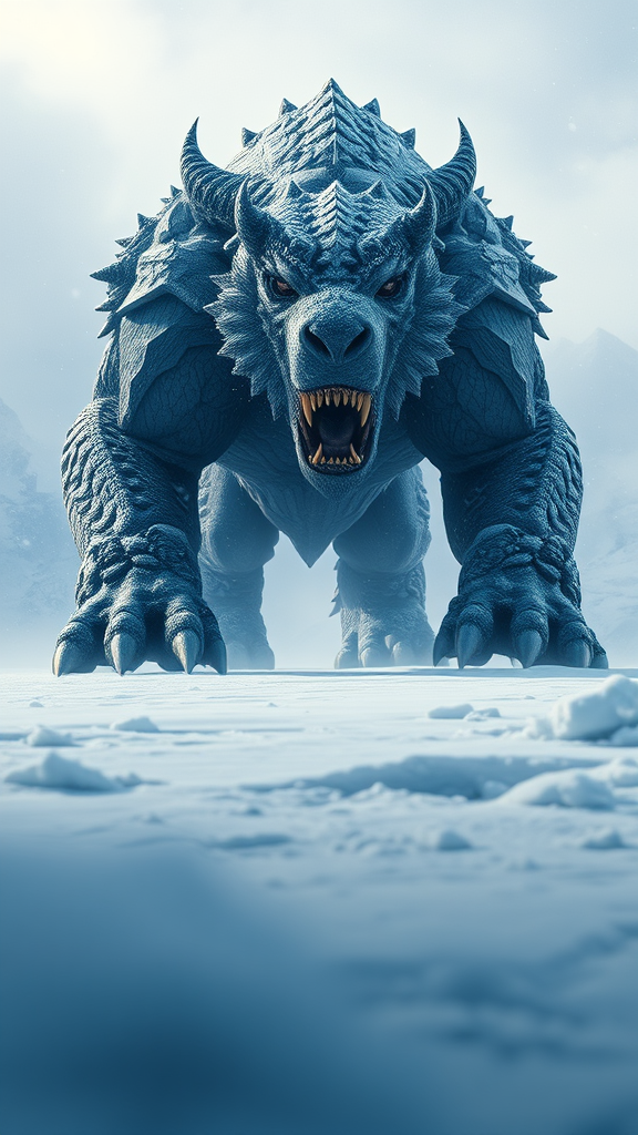 A colossal snow beast looms over the icy expanse, evoking the grandiosity of epic fantasy. With inspirations from the mythical manticore and explosive wildlife, the creature embodies dark gray hues and elements of caninecore, its piercing eyes showcasing a fierce determination. Carved with meticulous precision, each detail is rendered with hyper-realistic clarity in 32k UHD, akin to a masterpiece. As the creature strides forward, its formidable claws crunch the snow beneath, crafting an enchanting 2D game art tableau. This legendary beast, captured with the stark, detached ambiance of a National Geographic photo, channels the artistic spirit of Salvator Rosa. The scene, a fusion of digital art and fantasy, presents the beast with unparalleled detail and artistry.