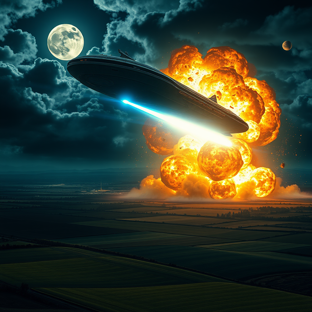 A colossal spacecraft looms menacingly over a vast, sprawling farm beneath a moonlit sky, unleashing a radiant blue beam of destruction. The explosion tears through the quiet night, debris catapulting in spirals as the farming landscape is consumed by chaos. The inferno lights up the dark, brooding clouds overhead, casting eerie shadows that dance across rolling fields, while flecks of burning embers drift into the surrounding darkness. The scene is richly detailed and vibrantly cinematic, with sci-fi elements intertwined in the vivid devastation.