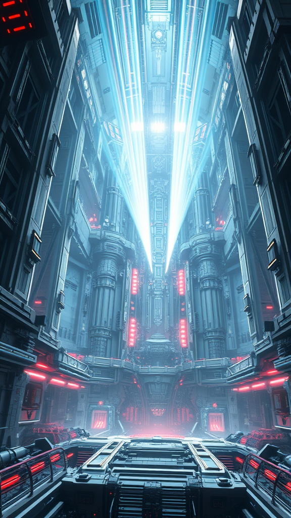 A colossal spaceship interior in the style of Tsutomu Nihei's Sidonia no Kishi, featuring towering structures and multi-level spaces. A central laser generator emits beams from above, filling the scene with pulsating energy clots and rapid acceleration. The environment is a blend of hyper-detailed, futuristic architecture and high-tech installations, rendered in vivid Sci-fi anime aesthetic. Light flashes dance across metallic surfaces, showcasing the speed and dynamic energy within this advanced world. The manga-influenced graphics are presented in ultra-high-definition, capturing every intricacy with stunning clarity.