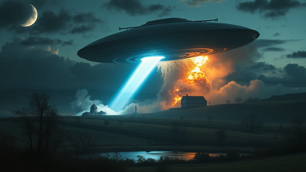 A colossal spaceship looms silently over a secluded rural landscape, its metallic surface reflecting the faint light of a crescent moon. Suddenly, a radiant blue beam erupts from the vessel, engulfing the farm below. The night sky is momentarily split with a blinding brilliance as the farmhouse and surrounding fields disintegrate into a chaotic whirlwind of debris, casting jagged shadows across the rolling hills. Flames burst forth, their flickering tongues painting the undersides of the ominous clouds a fiery orange. The surrounding trees and pond are bathed in an eerie glow, creating stark contrasts in the dim light, enhancing the surreal and cinematic atmosphere of this catastrophic event.