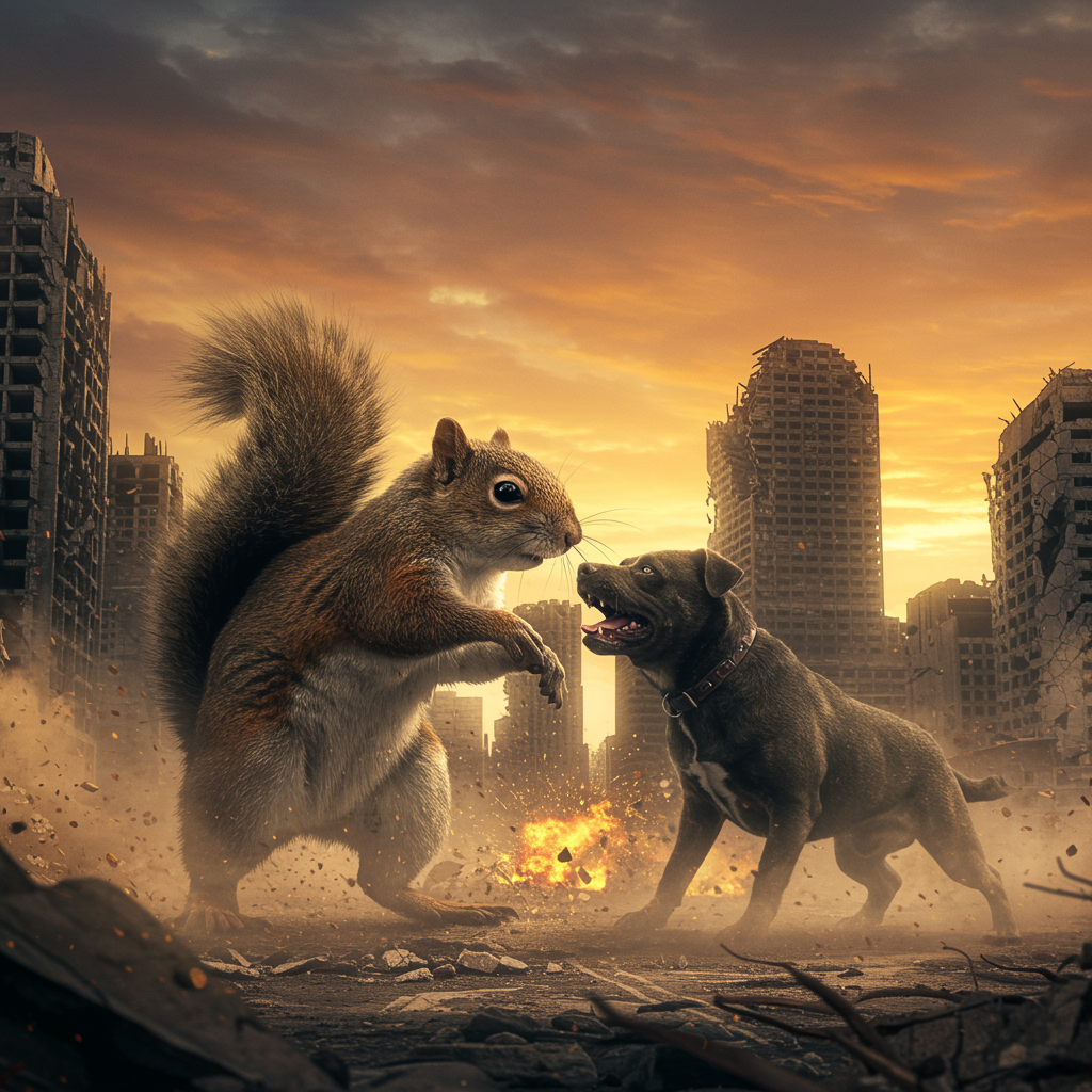 A colossal squirrel clashes with a mighty dog amidst the ruins of a ravaged metropolis, reminiscent of an epic King Kong versus Godzilla showdown. Amidst towering skyscrapers reduced to skeletal remains and streets littered with debris, the massive creatures engage in an explosive battle. The squirrel, with fur bristling and eyes gleaming with primal intelligence, lunges with acrobatic agility, while the dog, its coat mottled with dust and its growl echoing through the urban devastation, counters with raw, powerful force. The sky is painted in the orange hues of a setting sun, casting long shadows that dance around the creatures as they weave through crumbling infrastructure, each thunderous impact reshaping the cityscape. Dust and sparks fill the air as this titanic struggle unfolds in a scene of awe-inspiring chaos and destruction.