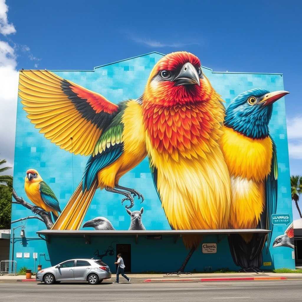 A colossal street art mural by the artist Chrysalis in Hawaii, blending life-like avian illustrations with a vibrant palette of aquamarine and amber, inspired by Dayak art. The artwork captures the essence of comic figurativism, as if seen through the lens of an Olympus AF-1 camera, showcasing the detailed feathers and dynamic postures of birds on a gigantic scale. A perfect representation of #screenshotsaturday, this mural invites viewers to immerse themselves in a world where nature and art intertwine with breathtaking realism.