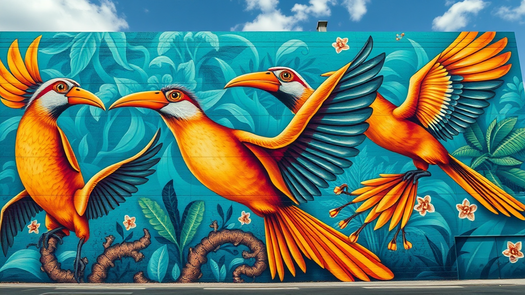 A colossal street mural by the artist Chrysalis in the heart of Hawaii, featuring vibrant, life-like avian illustrations. The artwork showcases a stunning color palette of aquamarine and amber, intricately blended with Dayak tribal artistic elements. Captured with the essence of an Olympus AF-1 camera, this massive piece exudes a sense of movement and dynamism. The work incorporates the whimsical essence of comic figurativism, bringing the birds to life with an imaginative flair, perfect for a #screenshotsaturday spotlight.