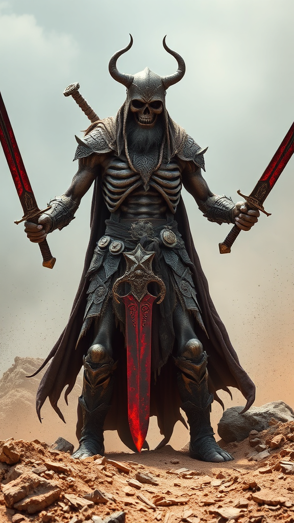 A colossal viking warrior stands imposing, wielding twin swords that shimmer with a dark bronze and deep red hue, embodying a crumpled and deconstructive aesthetic. The figure is skeletal and eerily realistic, emerging from dusty heaps, exuding a gothic and dark fantasy aura reminiscent of Antonio J. Manzanedo's style. Captured in a full-length body shot, the armor is intricately designed, showcasing the finest detailing of runes and mythical motifs. Each weapon gleams with hyper-realistic precision, reflecting a 4D dimension of existence. Ultra-detailed and highest in quality, the scene is illuminated with photography lighting that enhances the warrior's ultra-realistic presence, evoking an otherworldly yet lifelike image.