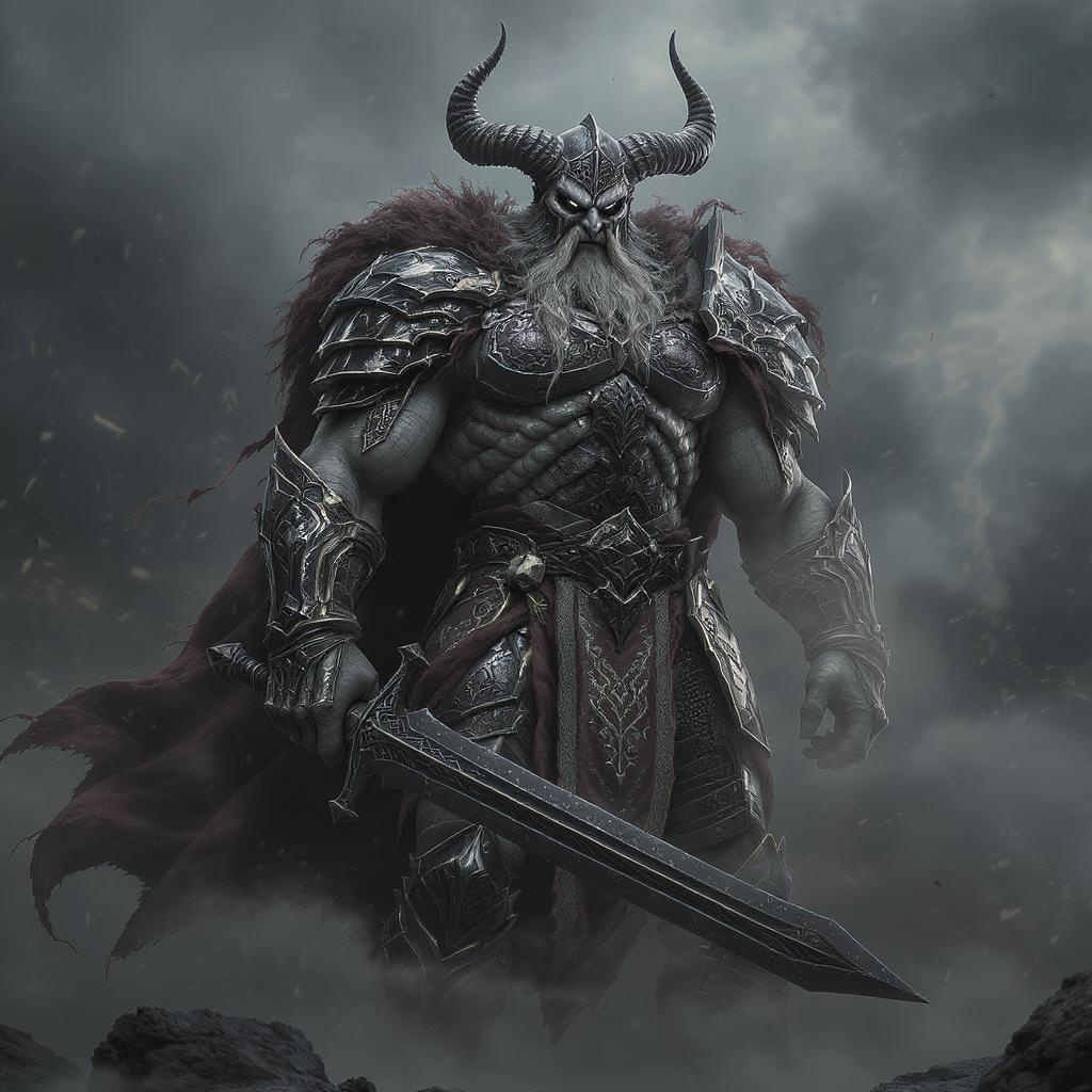 A colossal Viking warrior with twin swords stands amidst swirling mists, enrobed in ornate, dark bronze and deep crimson armor. Its form appears both solid and worn, a deconstructed elegance with skeletal features that add an eerie realism. Dust clings to his intricate chestplate, designed with dark fantasy motifs akin to a gothic tapestry. His armor, a masterwork of finely etched patterns, reflects the photography lighting with ultra-realistic clarity, as though capturing a moment from an ancient saga. The warrior's eyes, shaded beneath a horned helm, convey a haunting presence, accentuated by the hyper-detailed textures and layers that give a 4D dimension to his visage. This gothcore figure, as if carved from the shadows of mythology, stands with a regal menace in a world where imagination and reality intersect, showcasing the ultimate in design excellence.