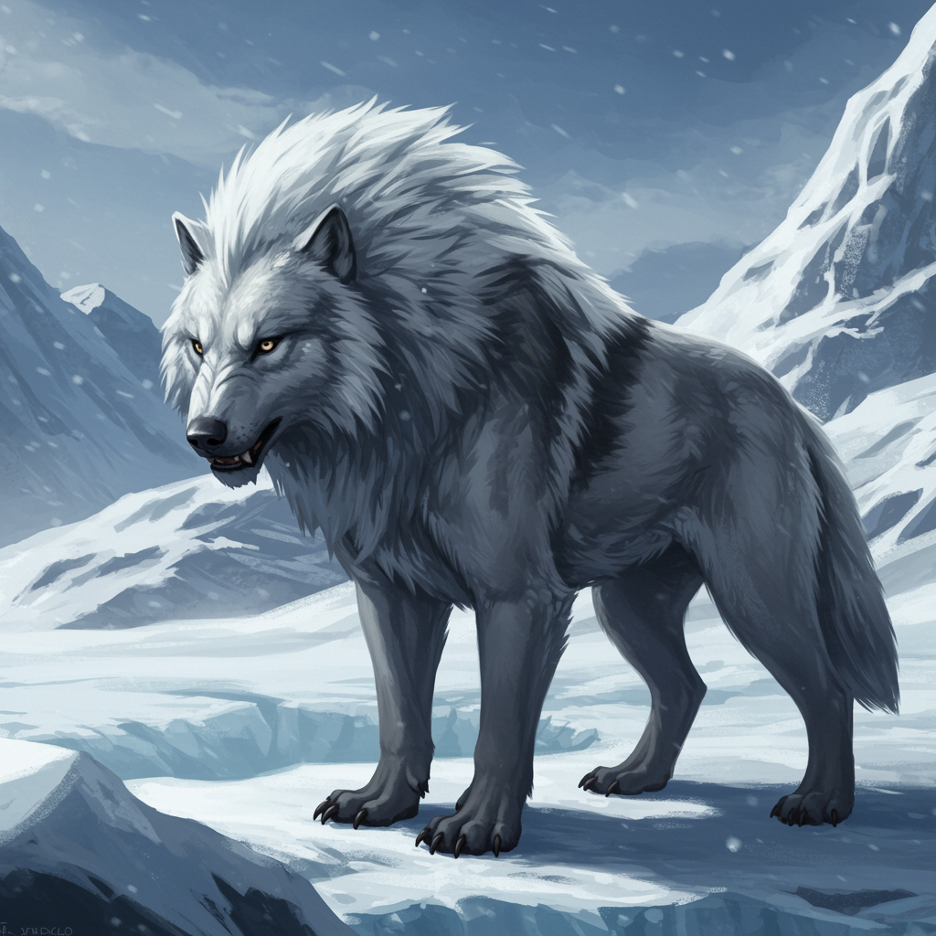A colossal wolf-like creature prowls near icy mountains, its presence commanding the snowy expanse. Crafted in a primitivist frenzy style, it resembles a manticore, its expressive face reminiscent of the works of Nicolas Mignard and Alexandr Averin. Its fur blends into the environment with shades of dark white and deep blue, exuding an aura of power and mystery. This enormous snow beast stands majestically on the ice, evoking the grandeur of epic fantasy landscapes, where explosive wildlife and the raw elements of nature converge. Rendered with terragen-like realism, its dark gray hue and fierce canine core convey a strong, captivating expression that echoes the untamed wilds.