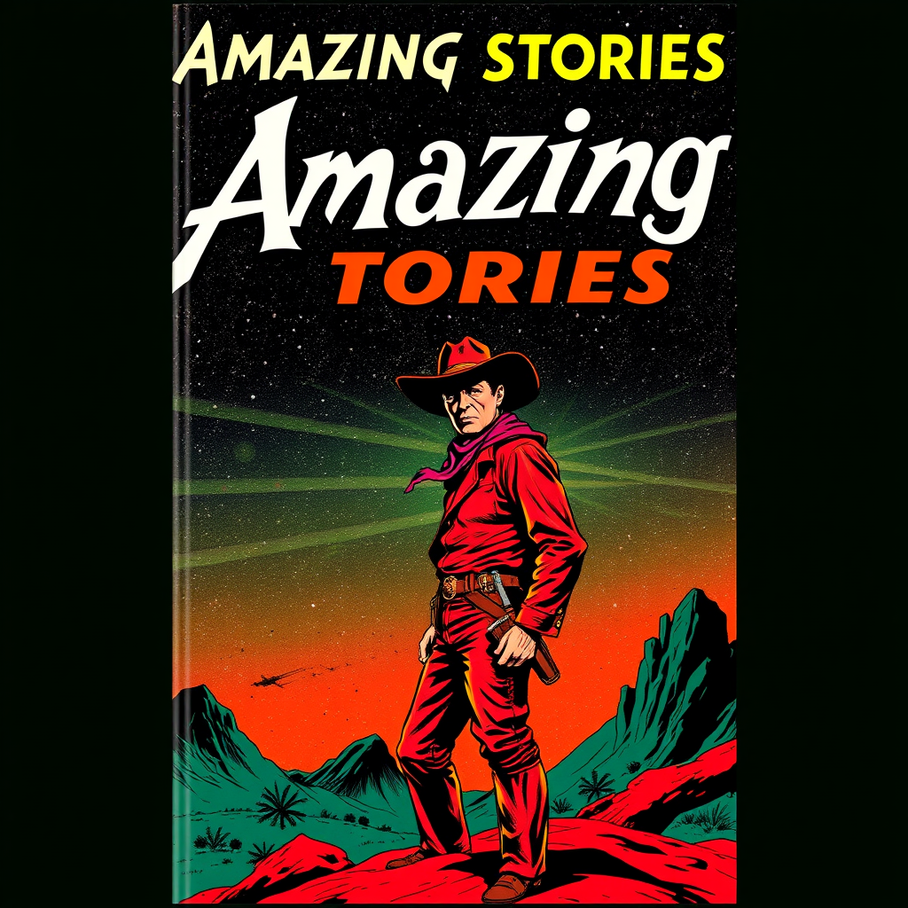 A comic book cover featuring a lone space cowboy, clad in classic Western attire including a wide-brimmed hat, set against the backdrop of a starry cosmic landscape. The design draws inspiration from 1940sā1950s comic art, with a color palette dominated by striking reds and rich greens. The art style is reminiscent of "Amazing Stories," blending dynamic and action-packed elements with romanticized realism. The cowboy strikes a heroic pose, enhancing the sense of adventure and mystery. The title, bold and eye-catching, echoes the adventurous spirit and intrigue of the era.