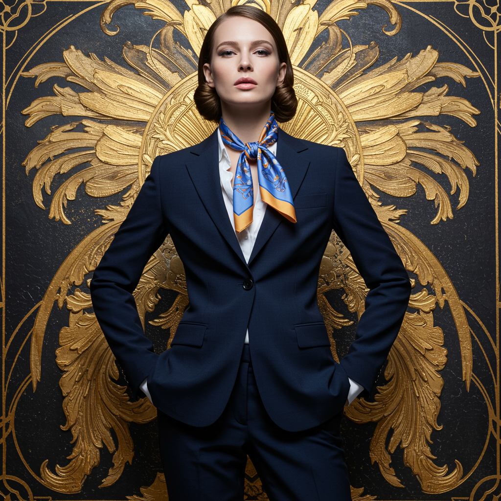 A commanding businesswoman radiates authority in her tailored navy pantsuit, with a silk scarf elegantly draped around her neck and her hair styled in a sophisticated bun. Her piercing gaze is captured with exquisite detail, enhanced by gold leaf and metallic accents that provide depth and texture to the hyper-maximalist artwork. This impressive, epic masterpiece merges the elegance of Art Deco and the organic forms of Art Nouveau, reimagined with a contemporary flair to highlight modern femininity and empowerment.