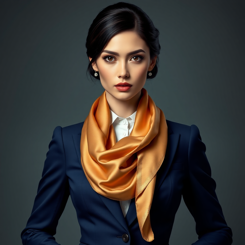 A commanding female businesswoman radiates power and elegance in a meticulously tailored navy blue pantsuit, complemented by a crisp white button-up shirt and an opulent silk scarf gracefully cascading from her neck. Her glossy jet-black hair is styled into a sleek bun, perfectly framing her distinguished features and penetrating gaze. The artwork captures the realistic subtleties of her expression, reflecting her strong determination and intellect. The high-definition image reveals the delicate stitching of her attire, the rich texture of the silk, and the subtle gleam of her patent leather heels. The art style is hyper-maximalist, fusing Art Deco and Art Nouveau influences with a modern flair. The integration of gold leaf and metallic accents adds depth and splendor, emphasizing meticulous attention to detail. This revolutionary artwork inspires wonder, presenting a unique and original portrayal of a formidable female presence. It is a breathtaking, grand masterpiece that embodies modern femininity and strength.