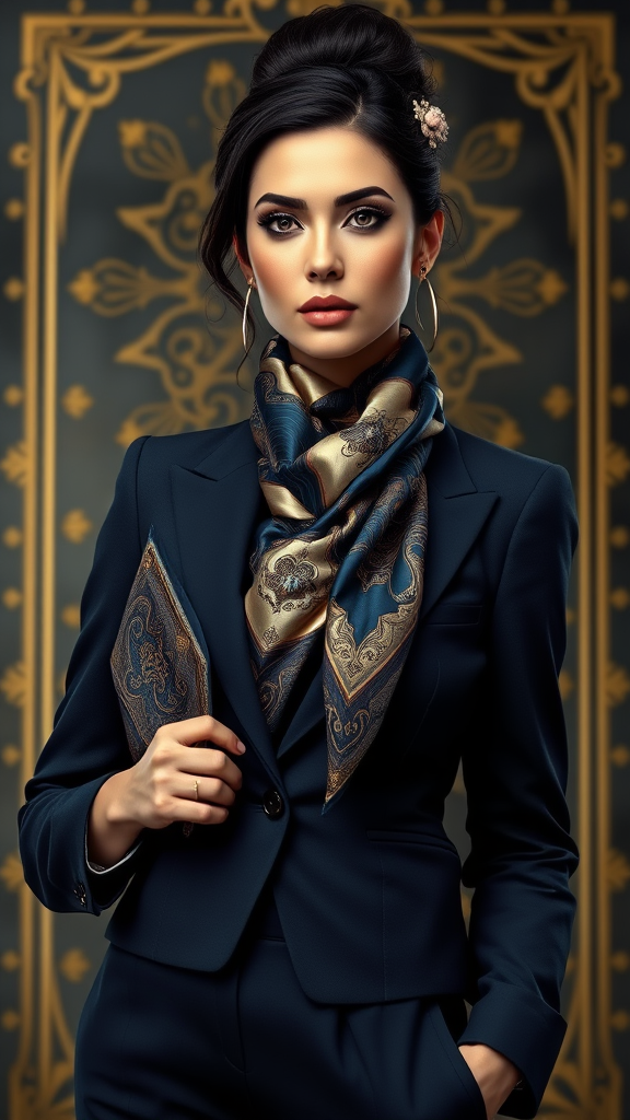 A commanding female entrepreneur radiates influence in her tailored navy pantsuit, complemented by a luxurious silk scarf and a sophisticated bun. Her piercing gaze is captured with intricate realism, while gold leaf and metallic accents bring depth and dimension to the hyper-maximalist artwork. This breathtaking masterpiece merges Art Deco and Art Nouveau styles with a modern flair, embodying contemporary femininity and empowerment. CGI elements create a vivid 3D render that emphasizes her strong presence and elegance.