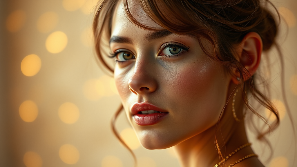 A commercial photo portrait of a young Instagram model, embracing sparklecore, showcasing shiny and glossy elements with clear edge definition. The model exudes unique, one-of-a-kind artistry, with a palette of light brown and light amber hues. Captured using a Fujifilm X-T4 and a Sony FE 85mm f/1.4 GM lens, the image presents an aspect ratio of 45:56. The highly detailed shot aims for a quality level of 2 and stylizes with a raw, artistic vibe, version 5.1.