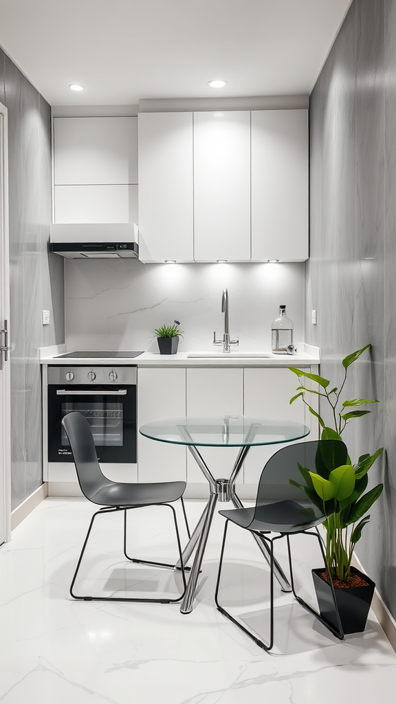 A compact kitchen featuring a sleek black and white kitchen set, polished white marble flooring, smooth gray plaster walls, a petite glass-top table with matching minimalist chairs, and vibrant green plants in geometric pots, all designed in a fusion of minimalism and high-tech interior design with subtle metallic accents.