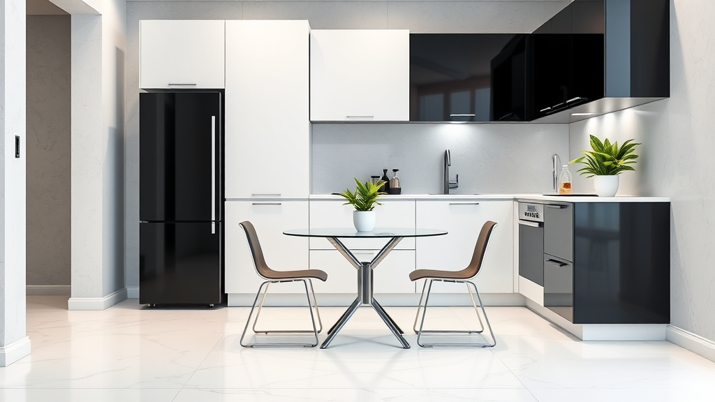 A compact kitchen featuring a sleek black and white cabinetry set contrasts with the pristine white marble flooring, while the subtle texture of the light gray plaster walls adds depth. A small, streamlined glass table with modern, metal-framed chairs sits invitingly in the center. Vibrant green plants in geometric pots bring life and freshness, embodying the minimalist and hi-tech interior design ethos.