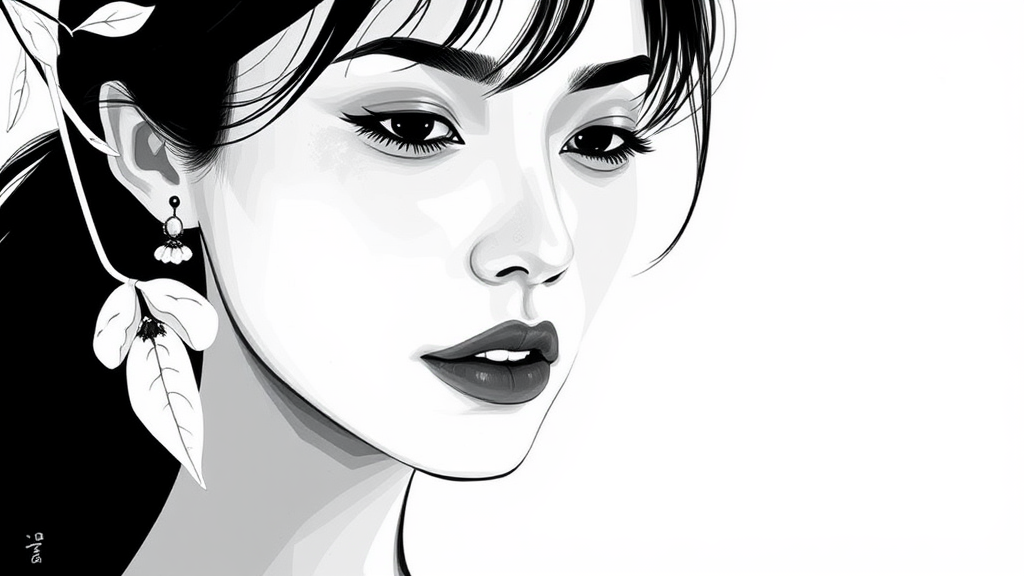 A compelling illustration of a woman in black and white, capturing serene elegance and effortless chicness reminiscent of Mario Testino's style. Her expression exudes tranquility, her features delicate yet strong, set against a minimalist background. The composition is subtly vibrant, interwoven with blink-and-you-miss-it details that whisper the influence of Chris Labrooy’s surreal creativity. Infusing a touch of Xu Beihong's mastery, the piece holds an organic fluidity, blending classic form with contemporary essence. The artwork's aspect ratio is long and narrow, emphasizing elongated gracefulness, enriched with a nuanced stylization that invites contemplation.