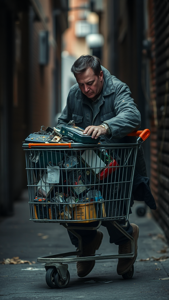 A compelling photograph captures a poignant moment featuring tech icon Elon Musk, dressed in tattered clothes as he maneuvers a shopping cart through a shadowy alleyway. The cart is laden with discarded electronic components, including outdated car batteries, which Musk is recycling at a nearby center. Despite his notoriety as a billionaire innovator, Musk has assumed the guise of a destitute individual, seamlessly blending into the urban landscape and eking out a living by repurposing electronic waste. The image underscores the stark dichotomy between Musk's present state and his public persona as a prosperous industrialist. Natural lighting imbues the scene with a raw, gritty texture, with the blurred background amplifying the candid and unrefined nature of the photo. The composition emphasizes Musk's posture, his head bowed and eyes cast downward, conveying an aura of despair and resignation. The photograph exerts a powerful impact, imploring viewers to contemplate the harsh realities of homelessness and the obstacles faced by those surviving on the margins. Hyper-detailed, with Super-Resolution, UHD, DTM, HDR, 8K clarity, the image is a vivid exploration of societal contrasts.