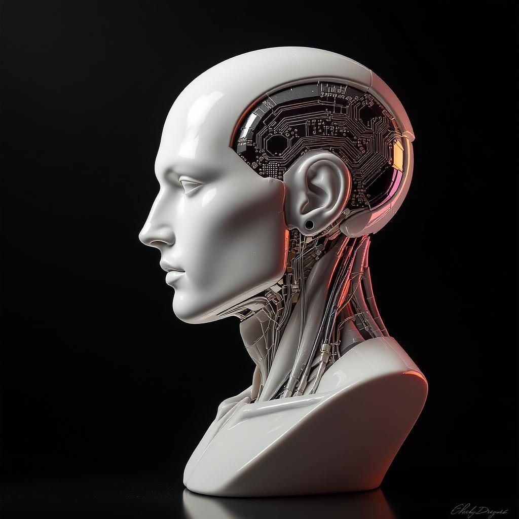 A complex 3D render of an exquisitely detailed porcelain profile of a man's android face, featuring cyborg and robotic components with vibrant microchip intricacies. Set in a soft studio light with an elegant rim light, the scene exudes a luxurious cyberpunk essence with anatomical precision. Elements like facial muscles, electronic cables, and microchips are seamlessly integrated into the design, offering a hyper-realistic view. The background is beautiful and elegant, rendered in 8K for maximum clarity and vibrant detail. Despite the intricate detail, there are intentional imperfections such as visible jpeg artifacts, distorted features like elongated necks, misplaced eyes and limbs, malformed proportions, and unusual anatomy to add a unique, morbid character to the figure. Elements of asymmetry include fused fingers, extra appendages, duplicated features, and other anomalies to create a digital sculpture with a distinct and unconventional aesthetic.