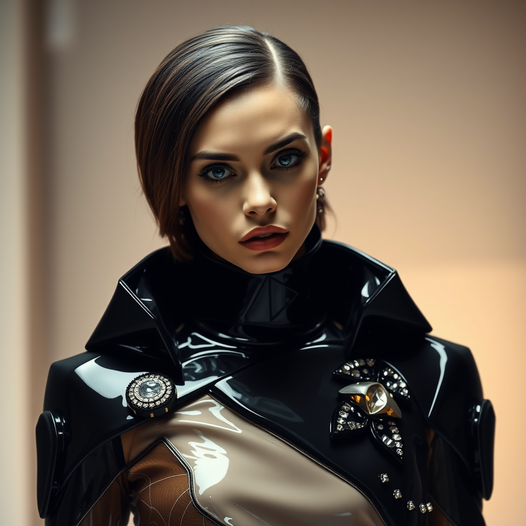 A composed female model gazes diagonally, adorned in lavish avant-garde attire crafted from sleek plastic and shimmering latex, featuring abstract geometric patterns and asymmetric techno embellishments. The scene is captured in a cinematic 4k medium shot, echoing Iris van Herpen's signature style, offering a futuristic yet sophisticated aesthetic.