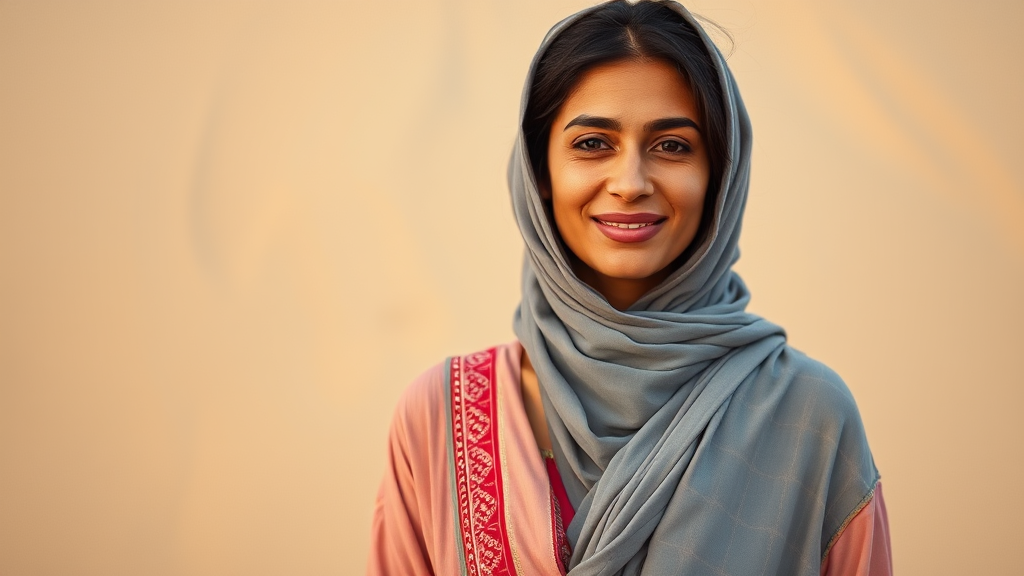 A composed portrait of a 30-year-old Arab woman standing gracefully against a soft, sandy background, exuding confidence and warmth. Her attire reflects cultural elegance, with subtle, vibrant hues enhancing her natural beauty. The ambient lighting softly highlights the contours of her face, emphasizing her serene expression and poised demeanor.