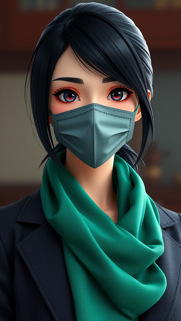 A composed woman with sleek black hair, an elegant charcoal jacket, and a vibrant emerald scarf, wearing a stylish cloth face mask, anime 3D rendering, ultra-high definition 8k quality, created using Unreal Engine, aspect ratio 9:16, designed in a dynamic and expressive style.
