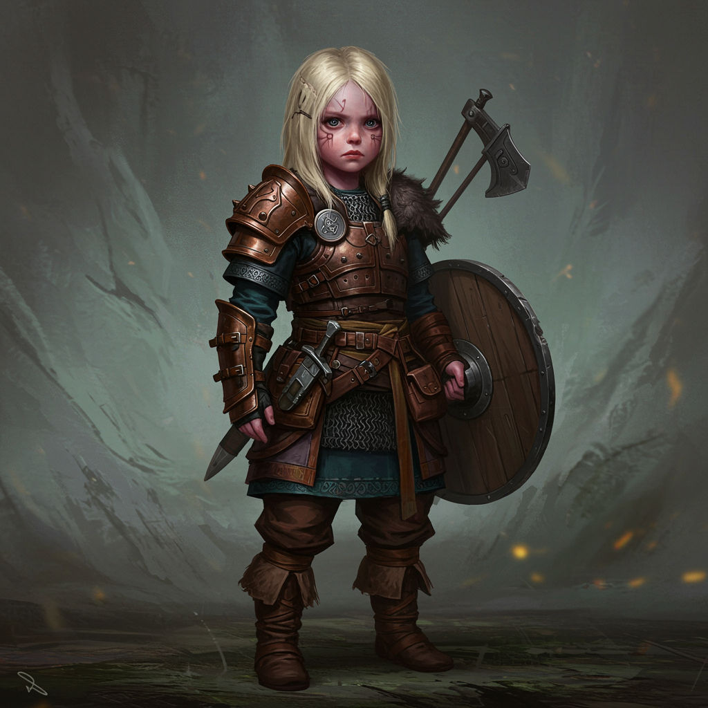 A concept art illustration of a young Viking warrior girl with intricate armor, embodying a biomutant style in a dystopian setting. The painting uses a dark, soft focus and is reminiscent of a plague-era oil painting on canvas. The scene is captured in a detailed 4K resolution, highlighting her small yet resilient frame. Her clothing is elaborate, combining traditional Viking elements with futuristic touches that hint at her unique biomutant nature. The background is abstract and slightly blurry, creating a mysterious atmosphere. The colors are intentionally muted to enhance the dark, moody vibe. Despite the surreal aspects of the composition, the girl's features are carefully crafted, avoiding any sense of distortion or disfigurement. Her expression shows determination, and her stance is confident, firmly grounding her within this dystopian world.