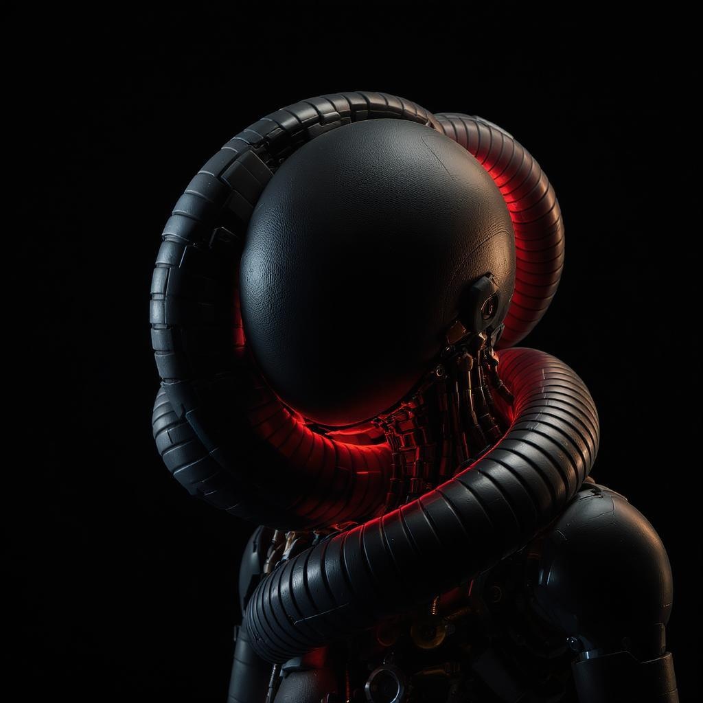 A conceptual portrait featuring a futuristic rubber sphere intertwined with a mechanical worm, illuminated by a glowing red light. The composition evokes the essence of technology-based art, reminiscent of Elina Karimova's style, with an emphasis on light black hues. The scene includes oversized robotic elements, seamlessly integrated into the overall design, creating a striking interplay between organic and synthetic forms.