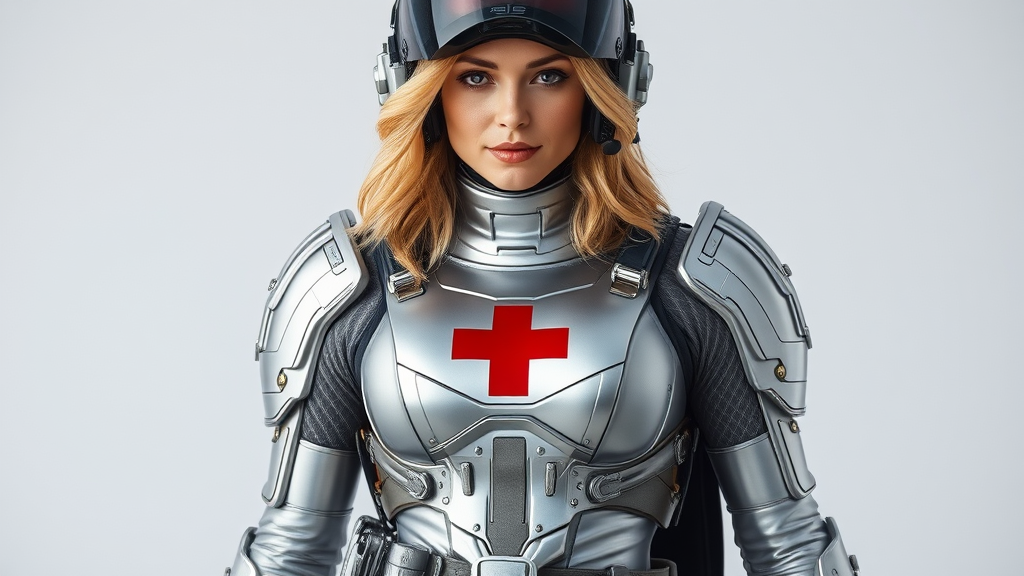 A confident adult female with an athletic physique and shoulder-length golden blonde hair is clad in gleaming silver combat armor that perfectly contours her form. She wears a seamless silver catsuit beneath, accentuated by a utilitarian belt bristling with sleek metallic tools. Her hands are protected by snug silver gloves, and the armor boasts a prominent red cross emblem at her chest, signifying her role as a medic. Her presence is both commanding and reassuring, topped off by a state-of-the-art fighter pilot helmet adorned with intricate markings, complete with an advanced visor that reflects her surroundings with a subtle iridescent sheen.