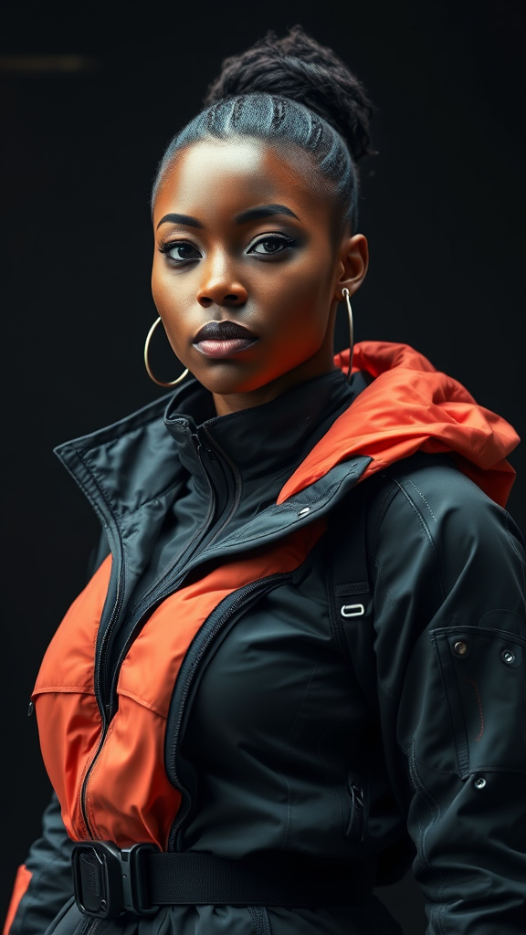A confident black woman wearing cutting-edge techwear, showcasing futuristic fashion with intricate details and sleek design, captured in an ultra-realistic style. Her ensemble features a blend of high-performance fabrics, layered textures, and functional accessories, highlighted under crisp studio lighting. The scene projects a sense of empowerment and innovation, with a focus on the harmonious balance between technology and style, emphasizing her poised expression and dynamic presence.