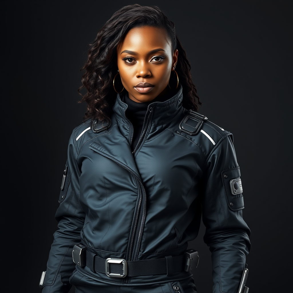 A confident black woman wearing futuristic techwear, showcasing intricate details and modern design in an ultra-realistic style, captured under perfect studio lighting. Her ensemble features a sleek, dark-toned jacket with reflective accents, paired with high-tech utility pants and innovative accessories. The backdrop highlights her attire's sophisticated textures and patterns. Her expression exudes strength and determination, complementing the advanced aesthetic of her outfit.