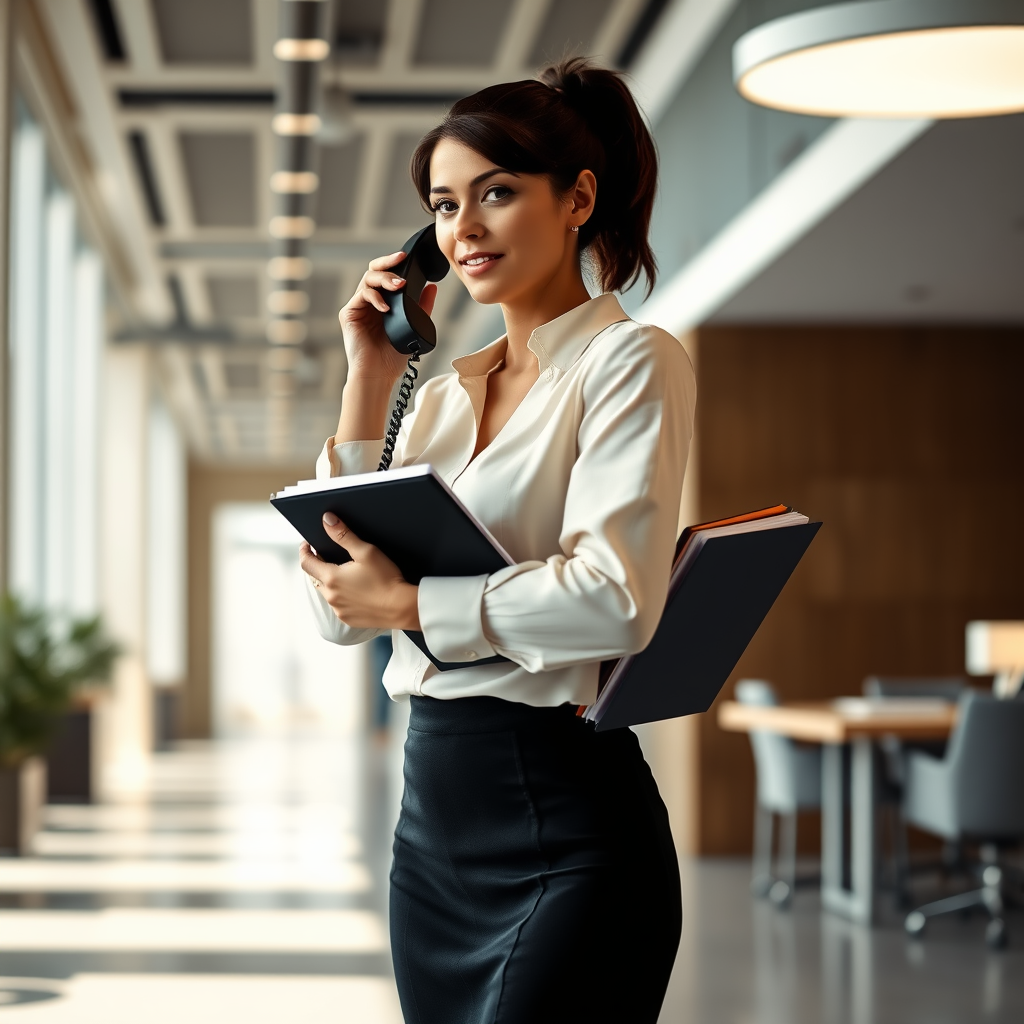 A confident brunette woman with short hair styled in a ponytail is gracefully navigating a modern office setting, answering the telephone with poise. She's donning an elegant blouse and skirt ensemble, her hands full with neatly organized notebooks. Captured from a low angle, the shot portrays her walking towards the camera with a dynamic and purposeful stride. The scene is bathed in diffused broad light, with a subtle backlighting effect that creates a gentle bloom around her, adding light sparkles and a touch of chromatic aberration for visual intrigue. The image is captured in smooth, sharp focus, highlighting her detailed eyes and the crisp elegance of her attire. The overall composition exudes an air of sophistication and professionalism, with a notable depth of field and impeccable clarity.