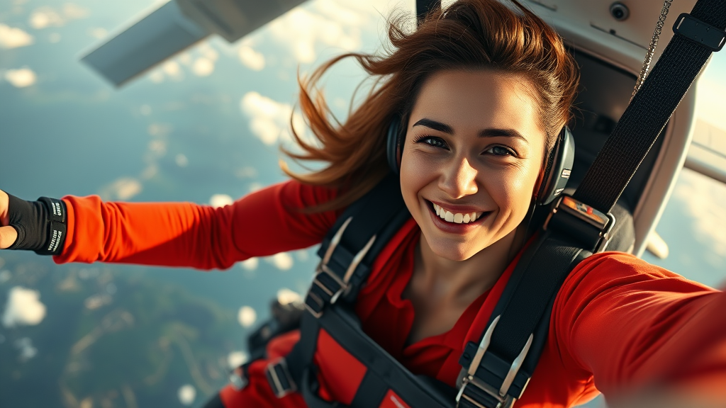 A confident female parachutist with a bright smile captures a stunning selfie as she gracefully leaps from an airplane, her full body in view. Her skin shows intricate detail, lending a photo-realistic quality, displayed in an 8k high-resolution format. The scene's color art is vivid, enhanced by soft, diffused lighting and a shallow depth of field to emphasize sharp focus and hyperrealism. The cinematic lighting imbues a dramatic tone, merging CGI and 3D artistry to achieve a seamless visual effect.