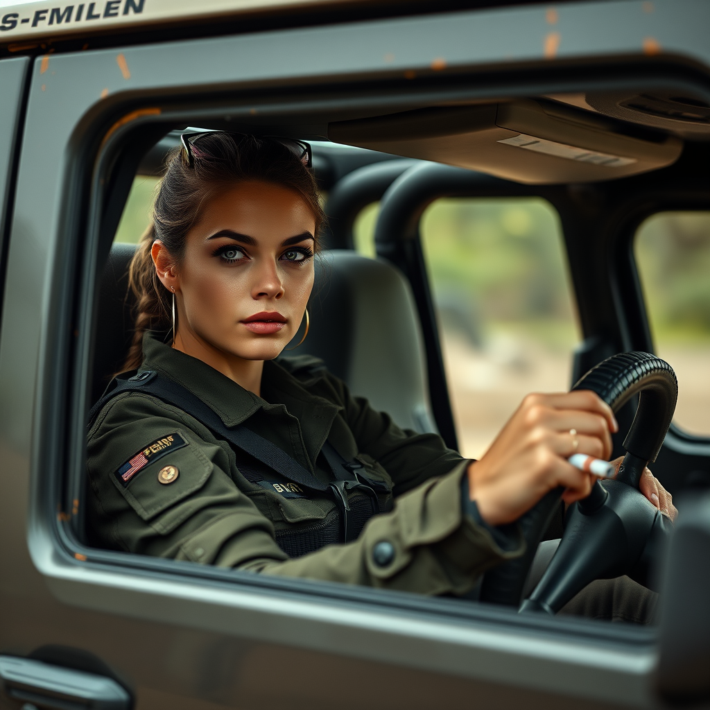 A confident woman clad in tactical attire, exuding an air of determination, sits behind the wheel of a rugged jeep. Her steady hand holding a cigarette as she navigates the terrain with practiced ease, her steely gaze focused and unwavering.
