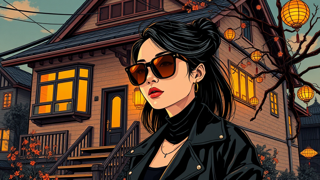 A confident woman in sleek sunglasses stands beside a vintage house, embodying a fusion of cyberpunk manga aesthetics with influences from Ross Tran and Chinese iconography. The scene is painted in a palette of dark black and luminous amber, featuring bold graphic illustrations. Traditional Chinese elements are woven throughout, set against rich, multi-layered color fields. The composition is inspired by innovative and vivid storytelling, with touches of futuristic and cultural symbolism, evoking a sense of modern nostalgia and visionary artistry, rendered in a striking vertical aspect ratio.